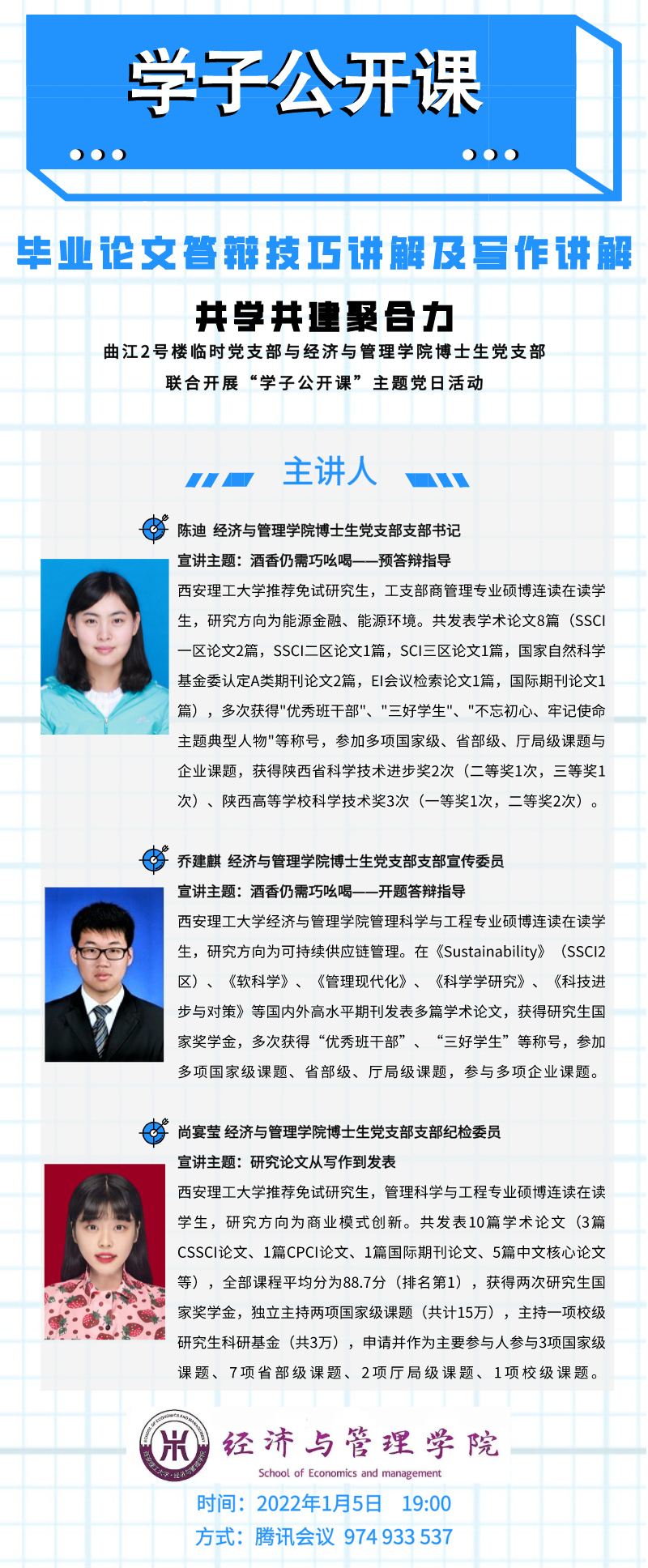 1月5日,304永利集团有限公司博士生党支部与2号楼临时党支部联合开展以“毕业论文答辩技巧与写作讲解”为主题的“学子公开课”线上主题党日活动,活动邀请到博士生党支部书记陈迪、纪检委员尚晏莹、宣传委员主讲乔建麒,2号楼临时党支部100余名党员线上参与,活动由院研会崔博文主持。