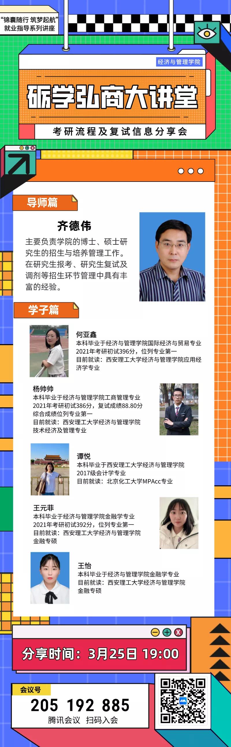齐德伟讲到,复试前要对报考学科、公司导师和国家政策有一个充分的了解,同时要对复试内容有充足的准备,才能胸有成竹地应对考试。齐老师还列举了一些在面试时可能会出现的突发状况,给考生提供了一些应对方法,指出无论发生怎样的情况都不要慌张,有条不紊的处理好即可。此外,齐老师对考研的政策、目的、价值及毕业选择进行了简要介绍。杨帅帅和谭悦等五位学长学姐分别结合自身经历从自我介绍、专业课复习、联系老师、调剂信息、复试突发状况处理获取等角度详细的为大家提供复试指导。