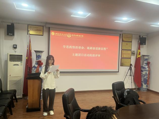 此次活动设置五分钟ppt展示和评委提问建议环节。各支部答辩人围绕各班“学思践悟担使命,砥砺奋进新征程”主题团日活动过程进行了答辩和总结,讲述了团日活动具体情况,并就存在问题提出了改进办法,汇报了活动感悟。国贸231团支部紧扣主题,以“破”“学、思”“践”“悟”“行”为主线,强调了学史鉴史的重要性;管233团支部以“弘扬五老精神,赓续红色血脉”向广大青年呼吁永远跟党走,发扬红色精神;金融231团支部以“团心无忘史,文物唤心声”为主题,通过文物讲述历史的厚重,把握历史发展脉搏,推进新时代青年思想建设;管231团支部主张不忘初心,号召青年们学习弘扬党史精神;研232501团支部以党史贯穿本次活动,坚定了新青年要永远跟党走;经济231团支部向党看齐,通过拍摄红色微电影践行文化自信,传承红色血脉。