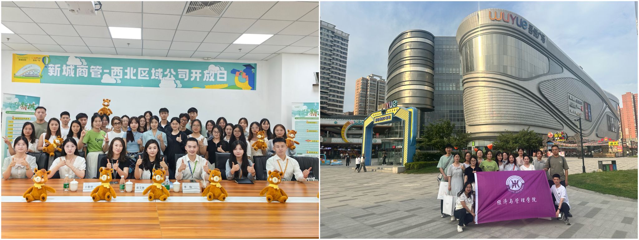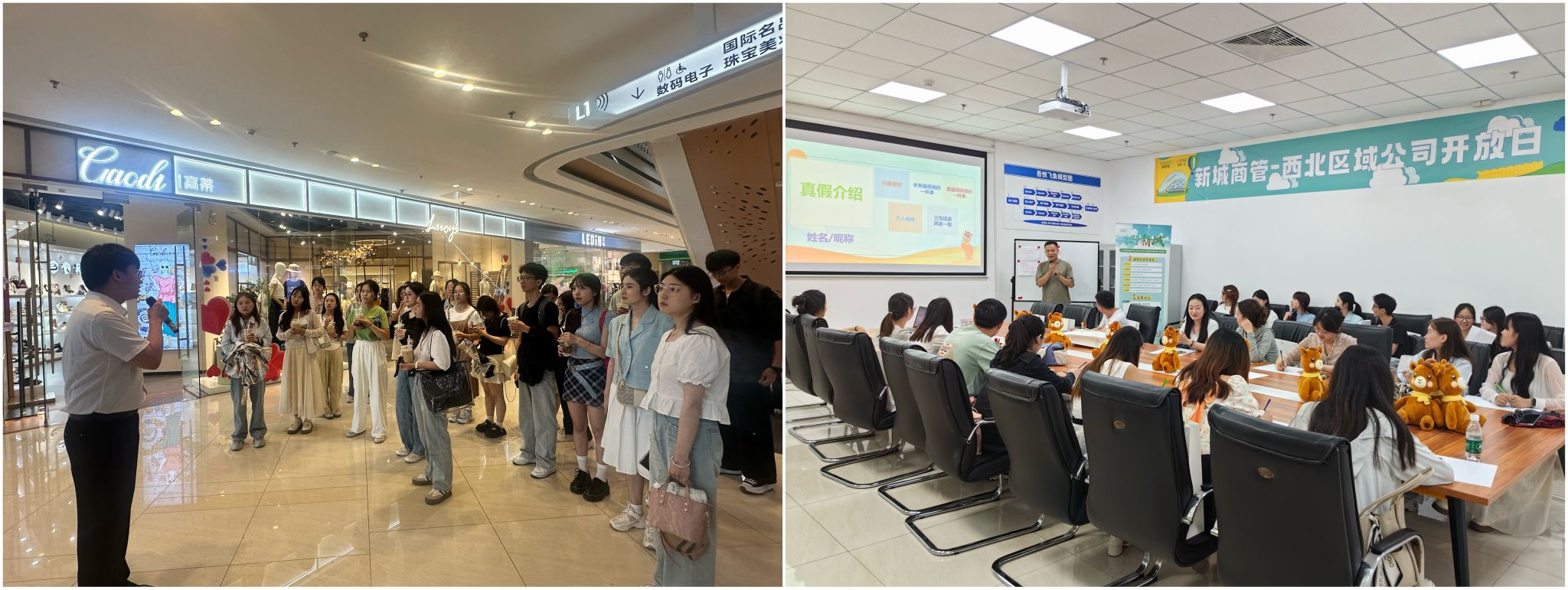 为丰富在校员工的职业认知和职场体验,搭建公司与用人单位之间高质量职业发展交流实践平台,6月13日下午,304永利集团有限公司25届本科生辅导员蒋艾琳带队,公司本科生、研究生一行20人赴西安西咸吾悦广场参加新城商管西北区域校园开放日”活动,新城商业西北区域副总经理(生态运营)王春华、副总经理(用户体验)孙仙杰、行政人事部副总经理李怡参加活动。