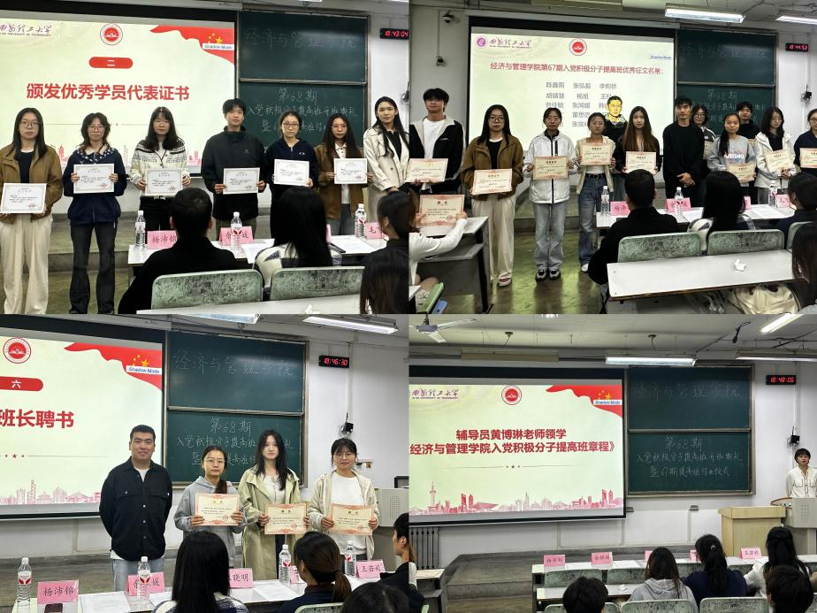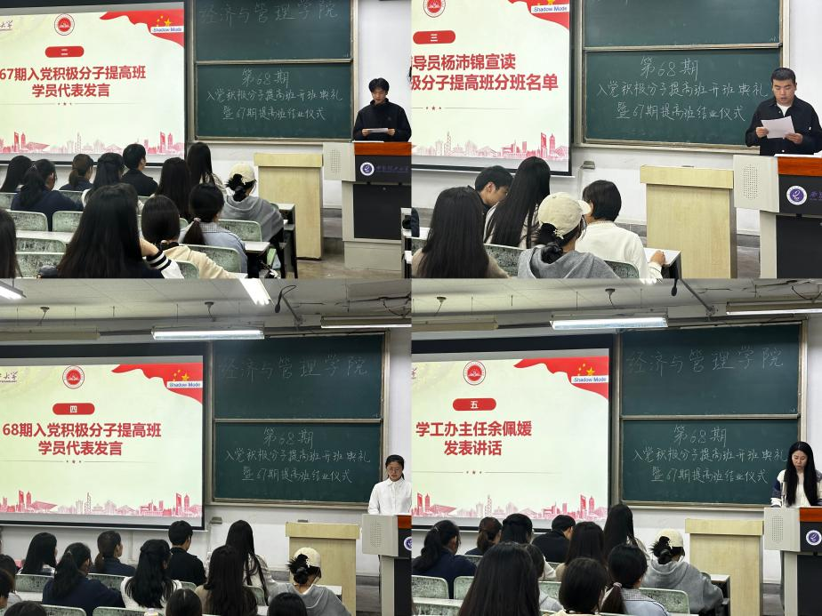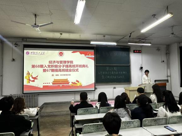 仪式在庄严的国歌声中拉开帷幕。首先,往期学员代表张弘毅上台发言。他结合自身在提高班的学习经历和成长感悟,分享了在党课学习、实践活动中的收获与体会,给新一期提高班学员传授经验,鼓励同学们端正心态、积极行动、以谦逊的品质学习交流。随后,学工办辅导员杨沛锦老师宣读了68期提高班分班名单。数管241班张雨佳代表新一期提高班学员发言,她表示,将以饱满的热情、昂扬的斗志投入到课程学习中去,严格遵守提高班的各项规章制度,认真学习党的理论知识,始终牢记“为人民服务”的初心,始终保持“求真、求实、求进”的态度,在思想上、行动上向党组织靠拢,让青春在为党和人民事业的奋斗中绽放光彩。学工办主任余佩媛发表讲话,她对本期入党积极分子提高班的顺利开班表示热烈祝贺,并对全体学员提出了殷切期望,她希望同学们要以“学”为基,筑牢思想之基,补足精神之钙;要以“行”为要,锤炼实干本领,彰显先锋本色;要以“志”为帆,永葆初心使命,勇担时代重任。接着,学工办辅导员王若婷老师为第67期提高班优秀学员颁奖、学工办辅导员毛飞飞老师为第67期提高班优秀征文获奖学员颁奖、学工办辅导员杨沛锦老师为第67期提高班班长颁发聘书。第67期提高班优秀学员们的榜样示范,给新一期提高班学员树立了前进的方向和榜样的引导,希望新学员用于争先,认真在提高班的培养中得到成长。最后,辅导员黄博琳老师领学了《304永利集团有限公司入党积极分子提高班章程》。
