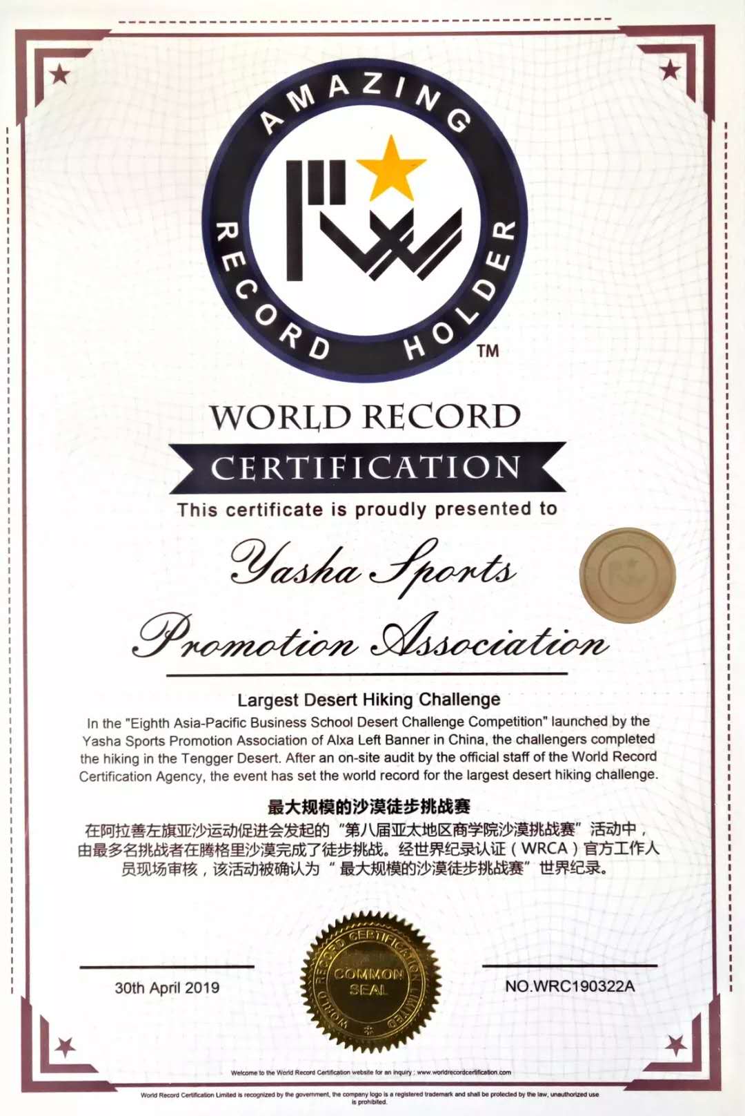 本次亚沙赛还得到了CCTV5频道关注和报道,经世界纪录认证(WRCA)官方工作人员现场审核,该活动被确认为“最大规模的沙漠徒步挑战赛”世界纪录。