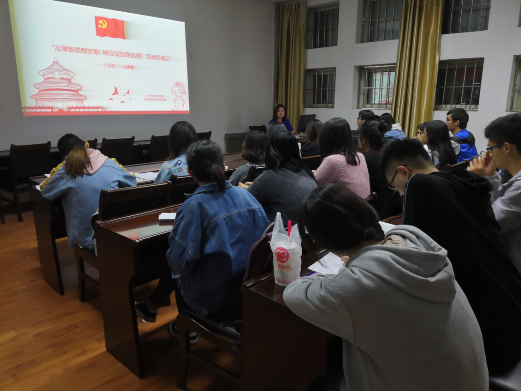 本次党课为支部“不忘初心、牢记使命”主题系列党课第一讲——“一个党员 一面旗帜”。支部书记闫如玉老师从多个角度引导员工党员要做政治上的领头羊、学习上的先进者、工作中的表率、生活中的支柱,鼓励同学们全面综合发展;闫老师还希望同学们时刻注重提高理论知识和思想觉悟,用党的理论武装自己;针对发生的社会热点问题,她希望大家能以实事求是的态度去分析和立论;党课最后,闫老师以《围炉夜话》中“人之足传,在有德不在有位;世所相信,在能行不在能信。”告诫同学们要以良好的道德准则和一名优秀党员的责任心来约束自己,率先垂范,以身作则,把责任心放在心上、扛在肩上,在思想上对标,行动上紧跟,做政治上的“明白人”,员工中的“先进者”。