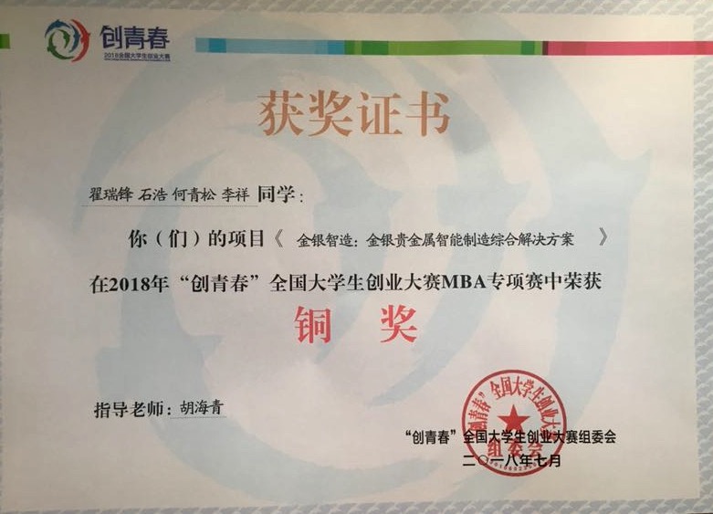2018年7月13日-15日,由共青团中央、教育部、人力资源和社会保障部、中国科协、全国学联、浙江省人民政府主办,共青团浙江省委、金华市人民政府、浙江师范大学承办的2018年“创青春”全国老员工创业大赛MBA专项赛和网络信息经济专项赛在浙江省金华市举行终审决赛。经过网络评审、现场答辩和集中评议等环节,公司参赛项目“金银智造:金银贵金属智能制造综合解决方案”获得MBA专项赛铜奖,取得了公司在该类赛事的最好成绩。本次比赛由304永利集团有限公司团委书记朱晓明带队,指导老师胡海青和项目组成员翟瑞锋、李祥共同参加了比赛。
