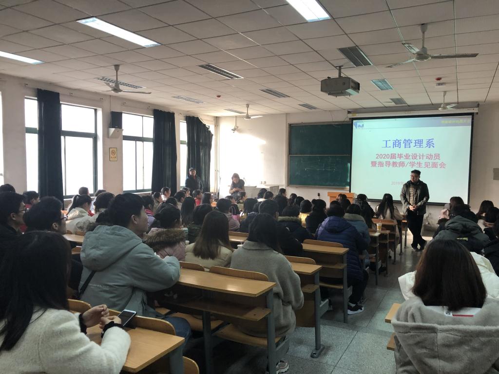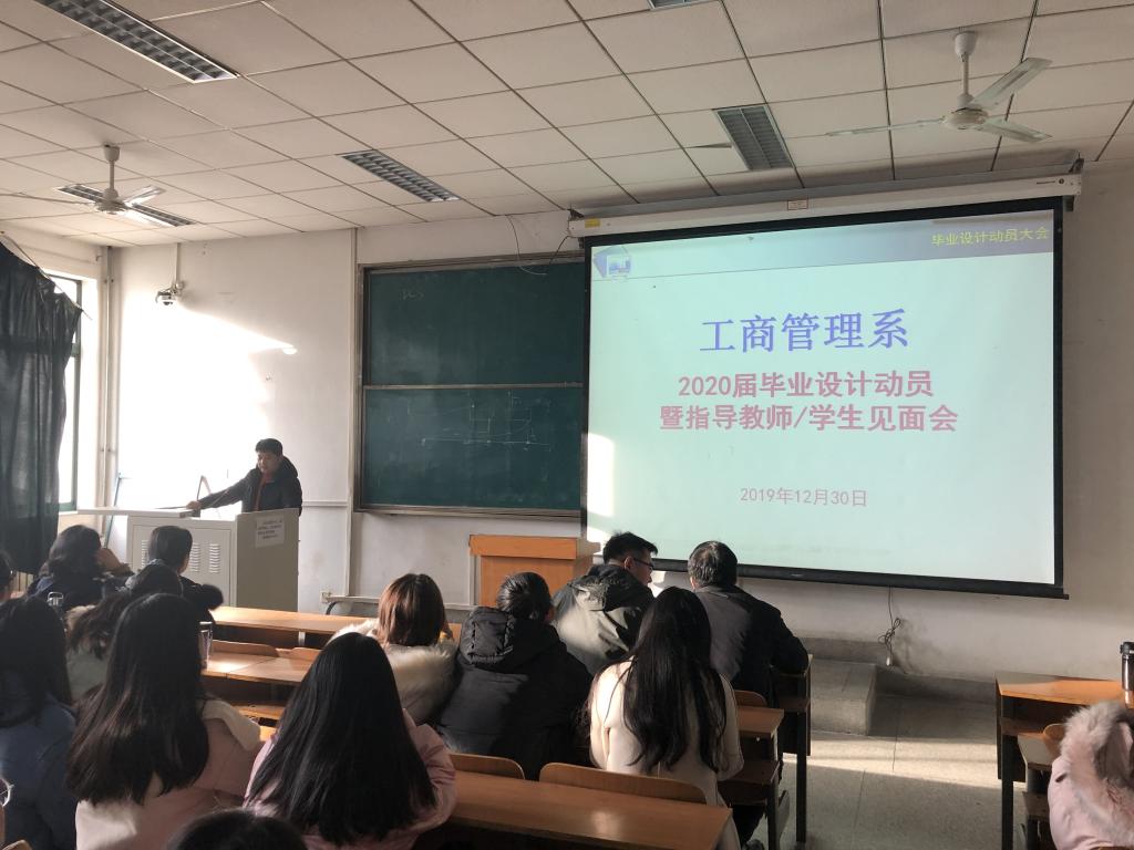 2019年12月30日上午,304永利集团有限公司工商管理系在教10-203举行2020届本科生毕业设计动员会暨指导教师与员工见面会。工商管理系主任甘凯、副主任杨毅与各专业部分教师代表以及全体2016级工商管理系员工参加了此次动员会。