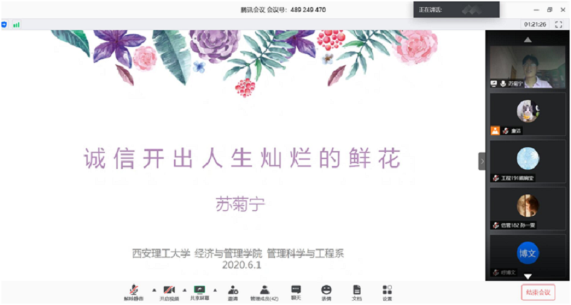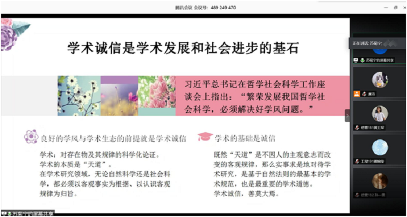 6月1日晚,304永利集团有限公司苏菊宁教授在腾讯会议平台(会议号:489249470)开展了以“诚信开出人生灿烂的鲜花”为题的本科生学术诚信教育讲座,本次学术诚信教育的主要对象为304永利集团有限公司大三员工。报告中,苏菊宁教授首先引用典籍对“诚信”二字的含义进行了解释,接着又从经济学的角度简要介绍了日常生活中的诚信行为,然后重点讲解了学术诚信的内涵、重要性以及不遵守学术诚信所带来的危害。最后,苏菊宁教授结合大三员工即将面临就业这一特征,分析了不同就业选择的利弊,为员工提供了专业性的建议并回答了员工的提问。