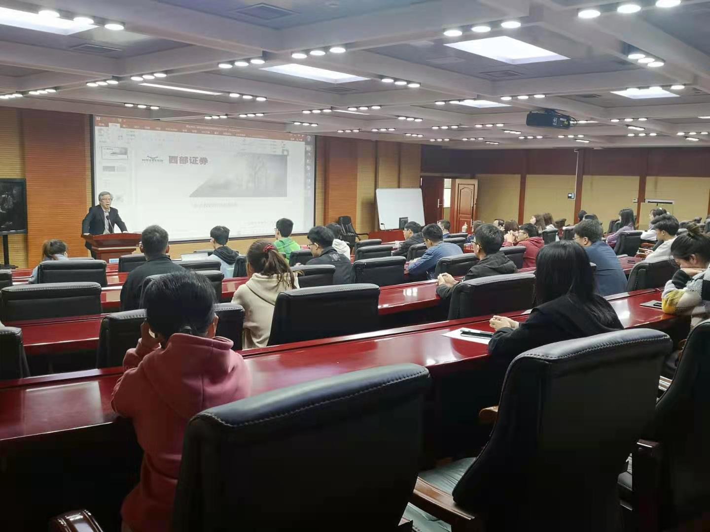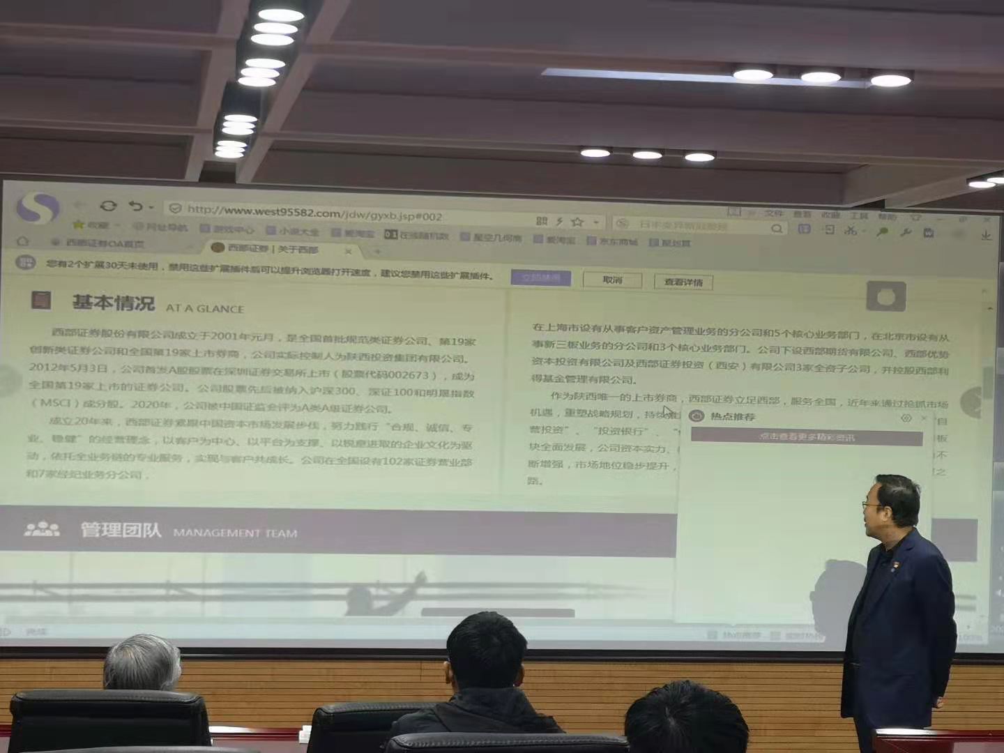 最后,蒋伟向大家讲解了证券行业的现状和前景,并对有意向从事证券工作的员工提出宝贵建议。他向大家介绍了西部证券的现状与发展战略,希望同学们积极应聘。