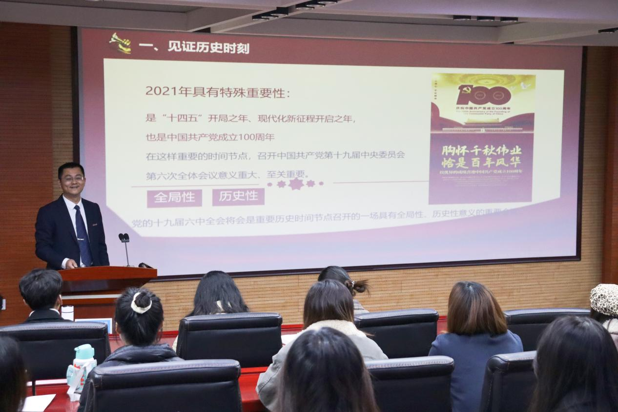 马宁副书记以《百年奋斗启新程 以史为鉴 开创未来——学习贯彻中国共产党第十九届中央委员会第六次全体会议精神》为主题,首先对十九届六中全会基本概况作以介绍,接着从“见证历史时刻”、“创造伟大成就”、“坚持宝贵经验”、“不负伟大梦想”四个方面对十九届六中全会公报内容进行系统阐述,结合党和国家的发展历程与当下国际形势,用深入浅出的语言和生动鲜活的事例阐释了“两个确立”、“四个伟大成就“、“五大历史意义”和“十个坚持”的丰富内涵和深远意义,对决议的重大创新和亮点展开深入解读。最后,马宁副书记引经据典,对党的三次历史决议进行梳理,引导员工更好地学习、认识这次历史决议的重大现实意义和深远历史意义,为员工上了一堂生动的形势与政策课。