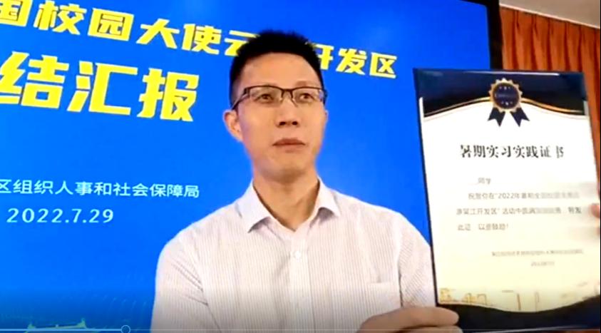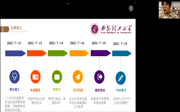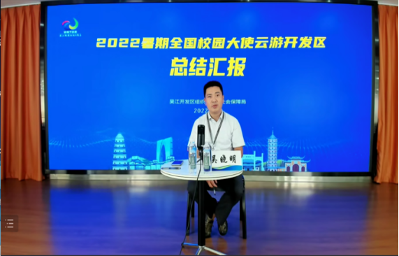 会议包含闭营仪式和心得汇报两个阶段。第一阶段的闭营仪式由吴江经济技术开发区人力资源有限公司总经理黄爱莉主持,双方领导进行发言。首先,王艳副经理代表304永利集团有限公司进行致辞,强调了实习对本科公司产品活动及本科生个人发展的重要性,表达了对吴江经济技术开发区及多家实习单位的衷心感谢,并对双方未来更加深入的交流与合作提出了展望。随后,钮国良副局长代表吴江经济技术开发区发言,表达了对“云游吴江”这种实习方式创新与探索的高度认可,欢迎各位西理工学子前来吴江实地参观、就业、创业,并宣布2022年暑期全国校园大使云游吴江活动圆满收官,在“云端”为各位同学颁发了实习证书。