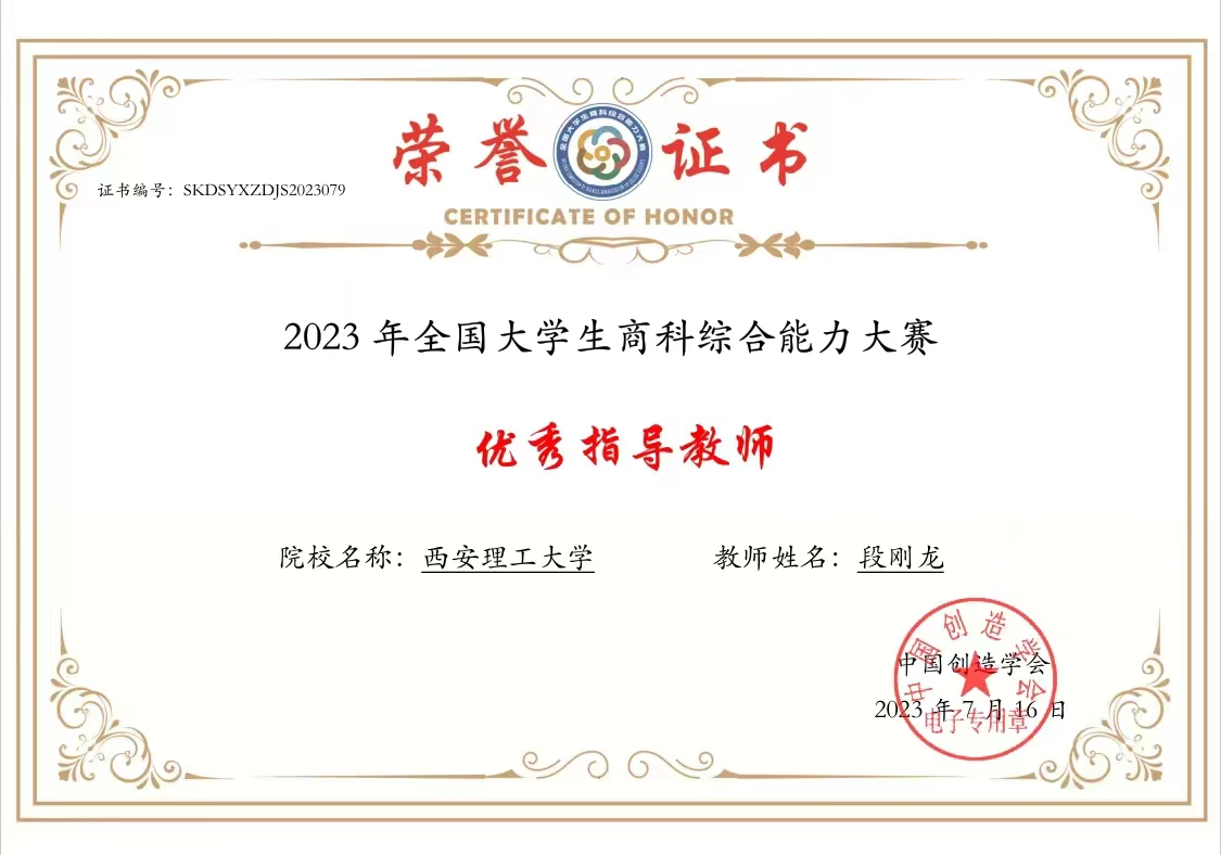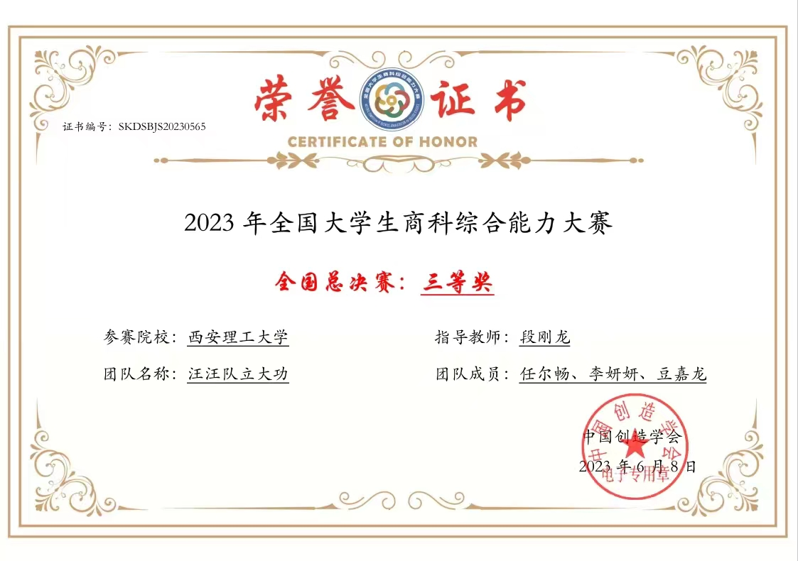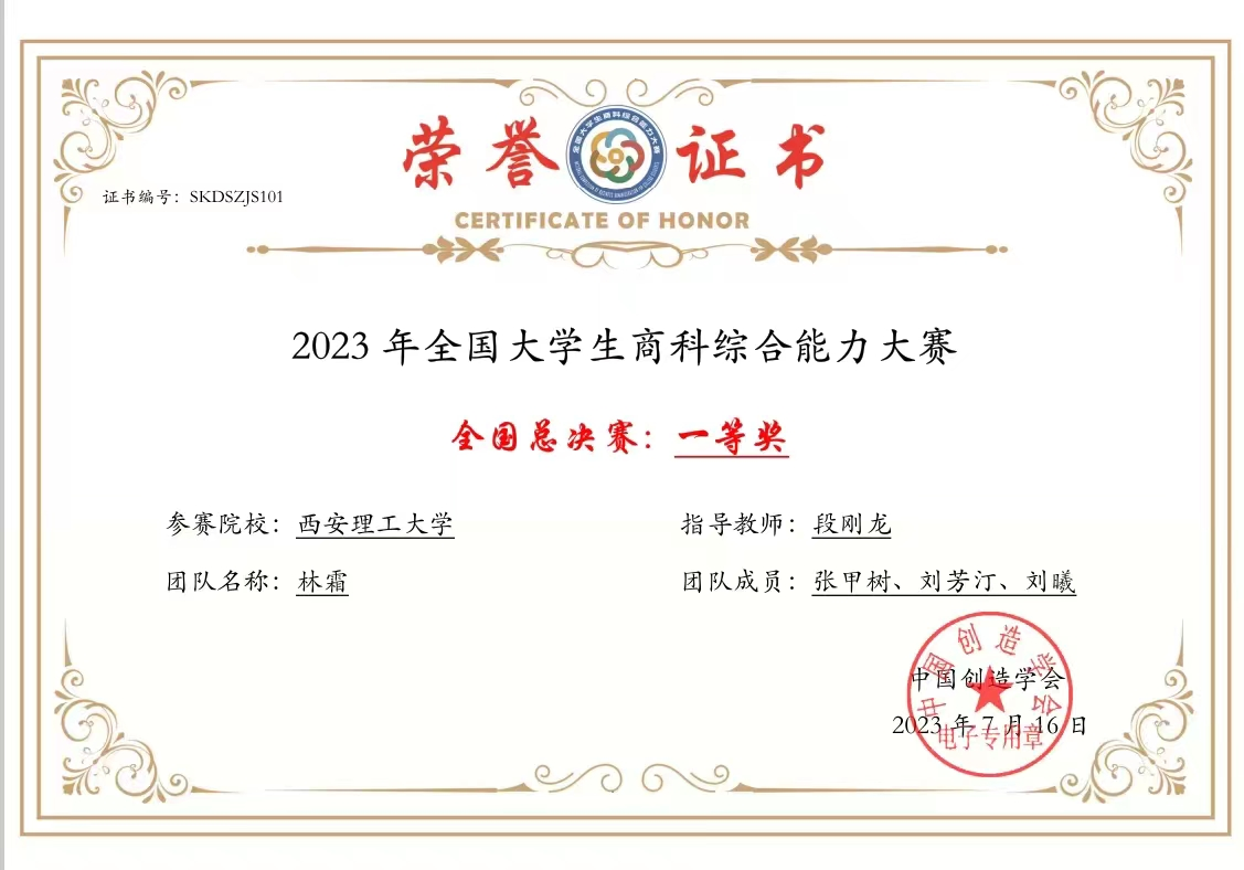 通过一天高强度的激烈比拼,由张甲树、刘芳汀、刘曦组成的林霜团队取得全国总决赛一等奖,段刚龙副教授获评优秀指导教师。在全国半决赛赛程中,由任尔畅、李妍妍、豆嘉龙组成的汪汪队立大功团队取得全国总决赛三等奖。