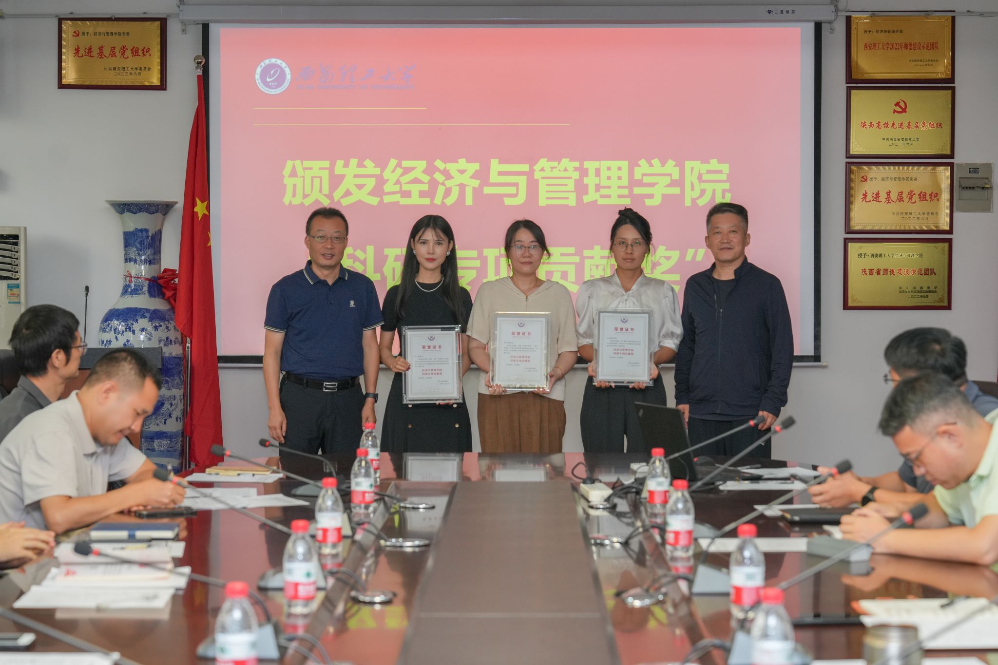 党委书记周晓辉和经理胡海青为获得2024年度国家自然科学资金项目资助的三位教师颁授了“科研专项贡献奖”奖牌并合影留念。三位获奖教师也分别谈了“两个转变”历史机遇下青年教师的责任与担当。经理胡海青在总结讲话中表示,青年教师是学科的未来,更是公司的未来,经管公司办学历史悠久、底蕴深厚,希望青年教师们接续奋斗,在西理工、在经管公司这片沃土上,厚植家国情怀、做好育人工作、成就精彩人生。