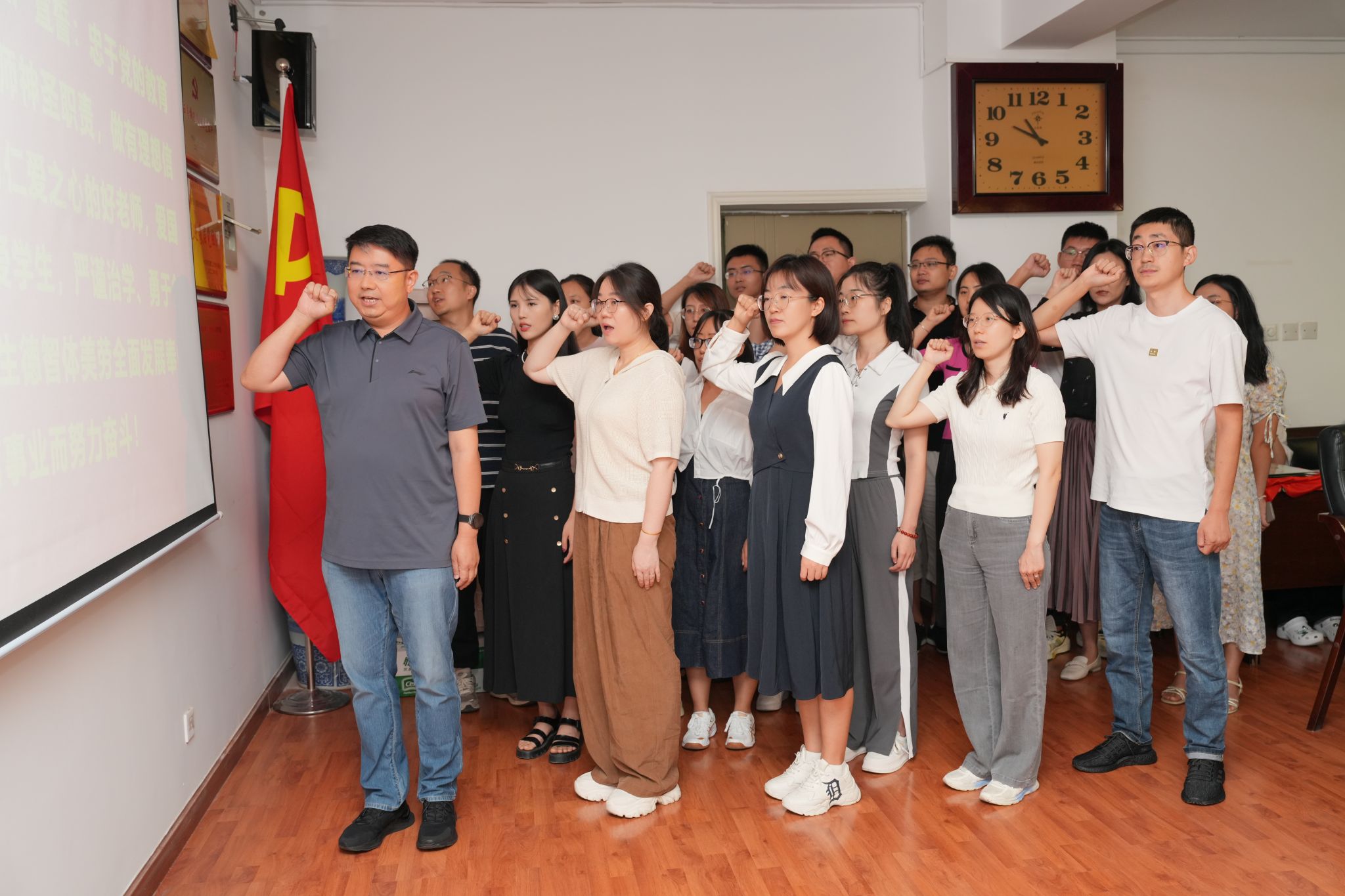 与会老师们重温了公司“砺学弘商宣传片”的精彩片段,更加坚定了“正心修身·砺学弘商”的办学使命。工会主席甘凯带领近三年新进教师做入职宣誓,“甘守三尺讲台,争做‘四有’老师”已是他们的毕生信念。教师代表杨水利从职业感想、育人使命、科学研究三个角度分享了自己从教37年来的体悟收获,“立业正当其时,立足现实情景解决真问题”是他对青年教师的殷切寄语。