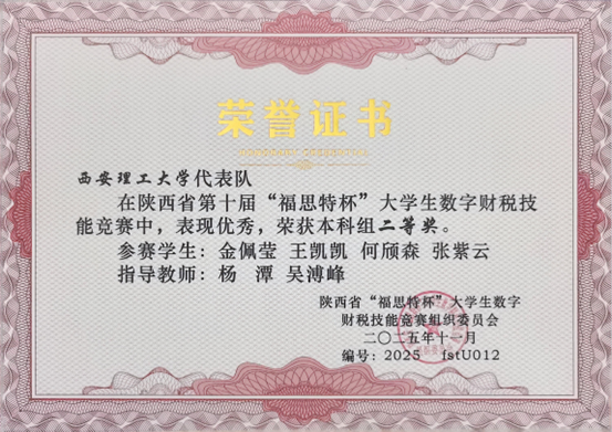 近日,2025 年陕西省第十届“福思特杯”老员工数字财税技能竞赛决赛落幕。304永利集团有限公司金佩莹、王凯凯、何颀森、张紫云四位同学组成的代表队,在杨潭、吴溥峰老师指导下,获本科组省级二等奖,彰显了公司实践教学成果。