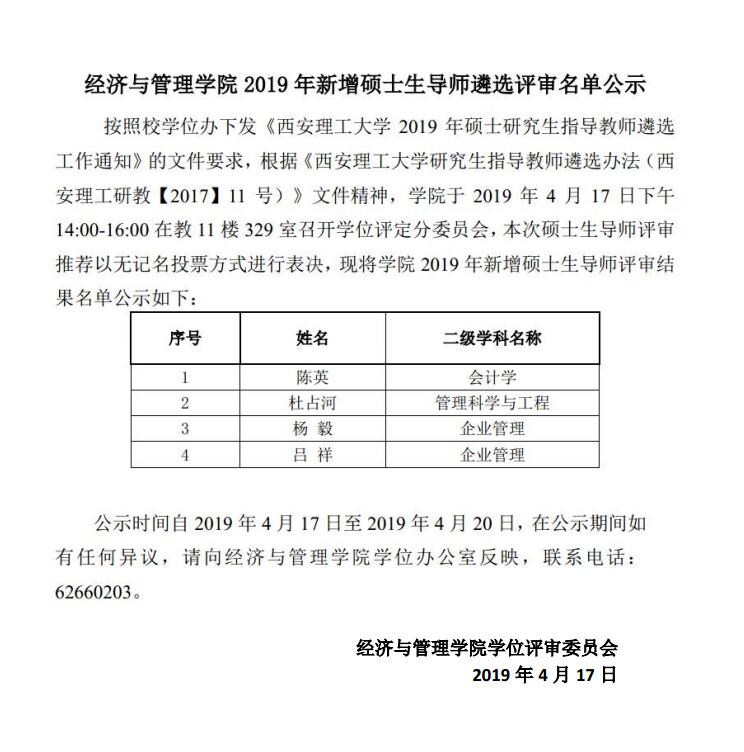 2019年新增硕士生导师遴选评审名单公示