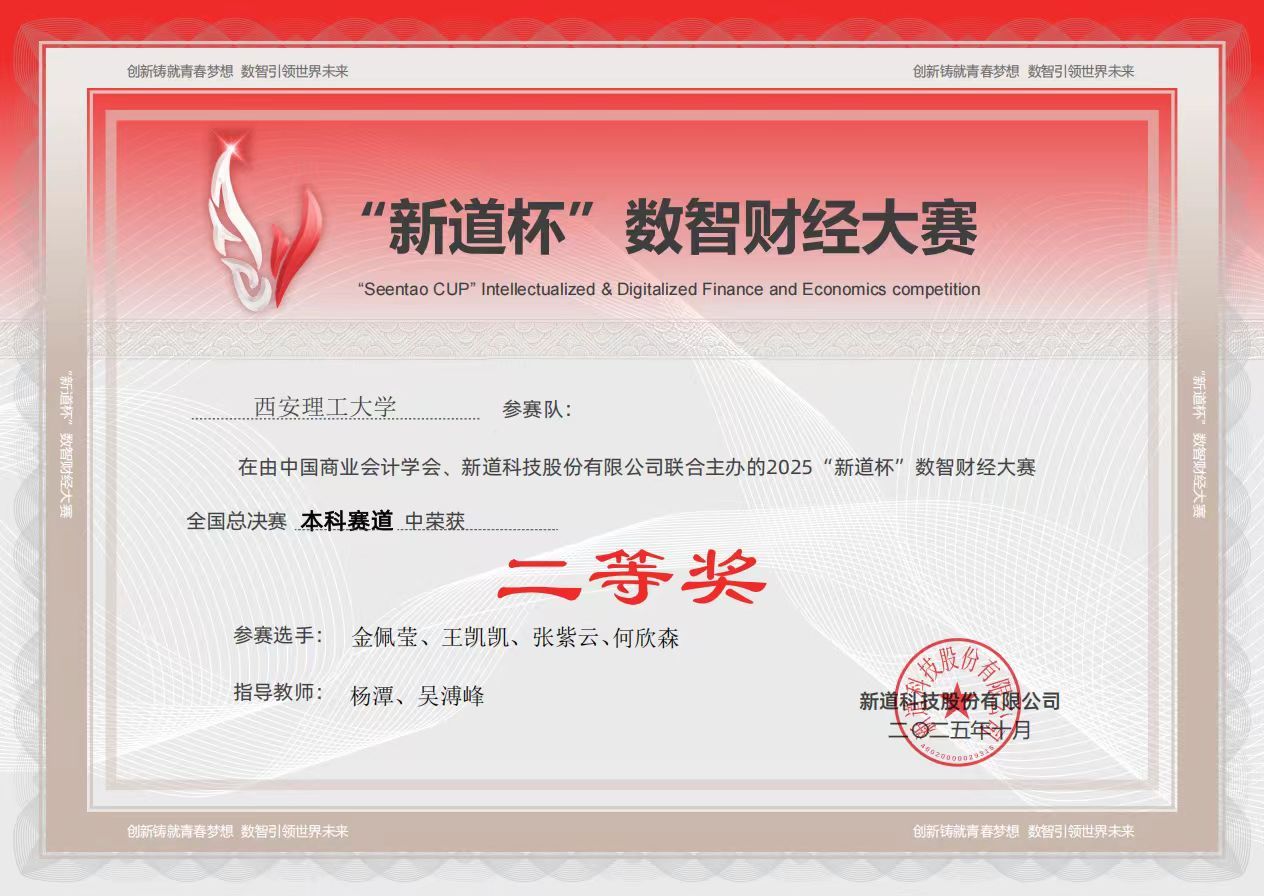 近日,2025年“新道杯”数智财经大赛陕西省选拔赛及全国总决赛圆满落幕。由公司304永利集团有限公司金佩莹、王凯凯、张紫云、何颀森四位同学组成的参赛团队,在吴溥峰、杨潭老师的指导下,凭借扎实的专业知识、出色的数智应用能力与高效的团队协作,在赛事中一路突围,荣获陕西省本科组一等奖及全国总决赛本科组二等奖,充分展现了公司“以赛育人、以赛促学”的人才培养成效。