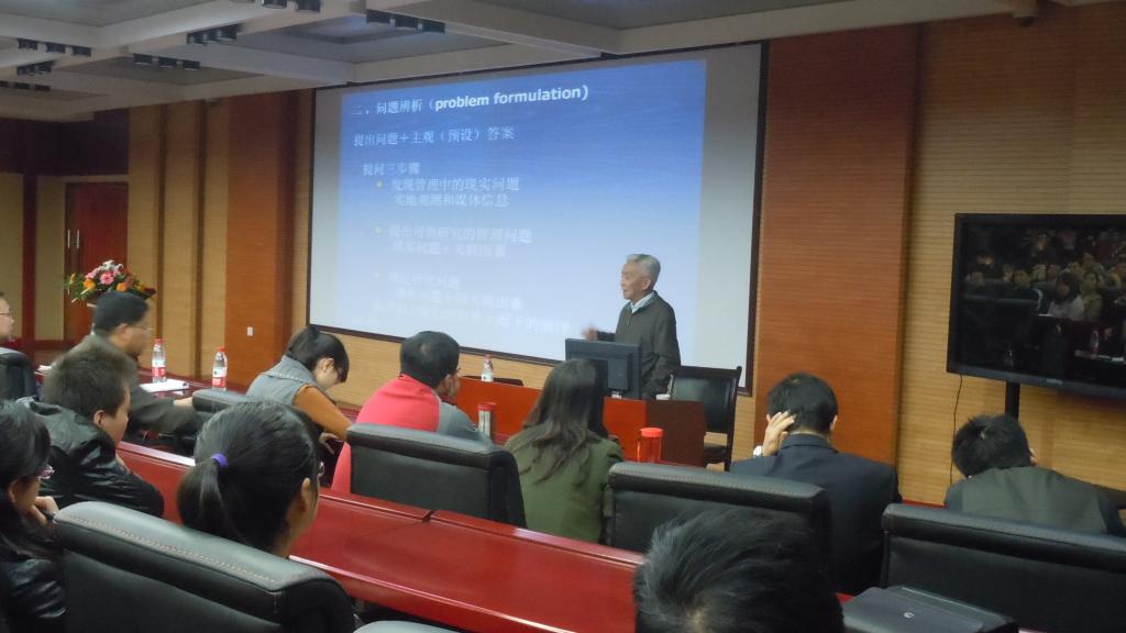 本次学术报告由西安交通大学304永利集团有限公司李怀祖教授主讲,304永利集团有限公司研究生管理负责人杨屹教授、张长征副教授等老师参加本次学术报告。首先,由杨屹教授对本次报告主讲李怀祖教授进行简要介绍。李怀祖教授就本次报告的主题——管理研究方法为同学们做了精彩的报告,主要包括两个部分内容:第一部分主要讲述论文研究工作过程,第二部分讲述学位论文的撰写方法。值得一提的是,本次报告最后穿插提问环节,公司员工积极参与讨论,在同李教授的提问与探讨过程中,在场的每一位同学都切身感受到了浓郁的学术氛围并受益匪浅,将整个学术报告气氛推向高潮。